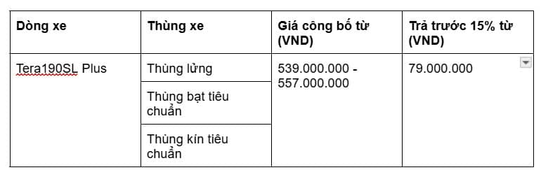 Tera190SL hiện nay đã không còn được phân phối rộng rãi trên thị trường và dần được thay thế bằng phiên bản nâng cấp mới Tera190SL Plus. Người mua xe tải nhẹ nên ưu tiên lựa chọn dòng mới để đảm bảo hiệu quả vận hành và chính sách hỗ trợ tốt hơn. Đây là thay đổi quan trọng cần nắm rõ trước khi quyết định mua xe. 1. Tera190SL có còn bán không?Hiện nay, Tera190SL không còn được phân phối rộng rãi trên thị trường và đã dần ngừng sản xuất. Dòng xe này chủ yếu chỉ còn xuất hiện dưới dạng xe tồn kho tại một số đại lý hoặc xe đã qua sử dụng. Nguyên nhân chính đến từ việc Daehan Motors đã nâng cấp sản phẩm nhằm đáp ứng tốt hơn nhu cầu vận chuyển thực tế, đồng thời cải thiện hiệu suất vận hành và tiêu chuẩn kỹ thuật. Vì vậy, các phiên bản mới được đưa ra để thay thế, phù hợp hơn với xu hướng sử dụng hiện nay. Trong thực tế, người mua xe tải nhẹ hiện nay thường ưu tiên lựa chọn dòng xe mới để đảm bảo khả năng vận hành ổn định, tiết kiệm chi phí lâu dài và dễ dàng bảo dưỡng trong quá trình sử dụng. 2. Dòng xe nào đã thay thế Tera190SL?Sau khi dòng xe cũ dần ngừng phân phối, phiên bản nâng cấp mới đã được đưa ra nhằm đáp ứng tốt hơn nhu cầu vận chuyển hiện nay. Trong đó, Tera190SL Plus là lựa chọn thay thế trực tiếp với nhiều cải tiến đáng kể về vận hành và hiệu quả khai thác. Phiên bản mới được phát triển theo hướng tối ưu chi phí sử dụng lâu dài, đồng thời nâng cao độ bền và khả năng vận hành ổn định trong điều kiện thực tế. Đây là lý do người dùng hiện nay có xu hướng chuyển sang lựa chọn dòng xe nâng cấp thay vì tìm mua xe đời cũ. Bên cạnh đó, dòng xe mới cũng được hỗ trợ tốt hơn về chính sách bảo hành, linh kiện thay thế và dịch vụ hậu mãi, giúp người dùng yên tâm trong quá trình sử dụng lâu dài. 3. Giá phiên bản mới Tera190SL Plus hiện nay bao nhiêu?Hiện nay, giá của phiên bản nâng cấp Tera190SL Plus dao động khoảng 539 – 557 triệu đồng, tùy theo loại thùng và cấu hình đi kèm. Bảng giá chi tiết Tera190SL Plus (*)(*) Bảng giá được áp dụng từ ngày 05/03/2026, đã bao gồm thuế giá trị gia tăng (VAT). Liên hệ ngay Hotline hoặc hệ thống đại lý Teraco để nhận báo giá tốt nhất. (*) Bảng giá có thể thay đổi mà không được thông báo trước đến Quý Khách. 4. Tera190SL Plus – Giải pháp vận chuyển toàn diện cho kinh doanhTera190SL Plus là dòng xe tải 1.9 tấn được phát triển theo hướng tối ưu hiệu quả khai thác thực tế, đặc biệt trong các nhu cầu vận chuyển hàng hóa cồng kềnh, khối lượng lớn và tần suất cao. Nhờ sự kết hợp giữa thùng hàng kích thước lớn, động cơ bền bỉ và hệ thống khung gầm chắc chắn, mẫu xe này đáp ứng tốt cả vận chuyển nội thành lẫn liên tỉnh. Không chỉ dừng lại ở khả năng chở hàng, Tera190SL Plus còn được đánh giá cao nhờ chi phí đầu tư hợp lý, dễ thu hồi vốn và phù hợp với xu hướng kinh doanh vận tải hiện nay. Thiết kế hiện đại, tối ưu cho vận hành thực tếNgoại thất của Tera190SL Plus mang phong cách hiện đại với thiết kế cabin đầu vuông, tạo cảm giác cứng cáp và ổn định khi vận hành. Kiểu dáng này không chỉ giúp tăng tính thẩm mỹ mà còn tối ưu không gian bên trong, mang lại tầm nhìn rộng cho người lái. Phần mặt ca-lăng được thiết kế theo dạng khối kim cương kết hợp viền chrome tinh gọn, giúp tổng thể xe trở nên sang trọng nhưng vẫn giữ được nét thực dụng của dòng xe tải. Hệ thống chiếu sáng được nâng cấp đáng kể với: