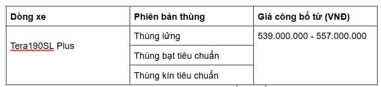 Giá xe Tera190SL Plus mới nhất tháng 4/2026 hiện dao động từ 539 – 557 triệu đồng, tùy theo loại thùng hàng. Đây là mức chi phí đầu tư tương xứng với hiệu suất vận hành, đặc biệt phù hợp cho các lộ trình vận chuyển nội thành và liên tỉnh ngắn. Với khả năng tối ưu hóa chi phí trên mỗi chuyến hàng, Tera190SL Plus là phương án đầu tư an toàn cho hộ kinh doanh và doanh nghiệp cần thu hồi vốn nhanh. 1. Bảng giá xe tải Teraco 190 (Tera190SL Plus) mới nhất 2026Hiện nay, mức giá niêm yết của dòng xe này đang dao động từ 539 – 557 triệu đồng, tùy thuộc vào loại thùng (lửng, bạt, kín). Cần lưu ý rằng, Teraco 190 thực chất là cách gọi phổ biến mà người dùng dành cho phiên bản Tera190SL Plus. Việc sử dụng tên gọi này giúp khách hàng dễ dàng nhận diện sản phẩm dựa trên thương hiệu và mức tải trọng 1.9 tấn đặc trưng trên thị trường. Sở dĩ Tera190SL Plus duy trì được sức hút lớn trong phân khúc xe tải nhẹ là nhờ sự kết hợp giữa mức chi phí đầu tư hợp lý và khả năng vận hành bền bỉ. Với lợi thế thùng siêu dài 6.2 m, mẫu xe này giúp giải quyết triệt để bài toán hiệu suất cho những đơn hàng cồng kềnh, trở thành công cụ kinh doanh đắc lực giúp tối ưu hóa lợi nhuận cho hàng nghìn hộ kinh doanh và doanh nghiệp trên cả nước. Bảng giá chi tiết Tera190SL Plus (*)(*) Bảng giá được áp dụng từ ngày 05/03/2026, đã bao gồm thuế giá trị gia tăng (VAT). Liên hệ ngay Hotline hoặc hệ thống đại lý Teraco để nhận báo giá tốt nhất. (*) Bảng giá có thể thay đổi mà không được thông báo trước đến Quý Khách. Phân tích giá trị đầu tư theo loại thùng hàng