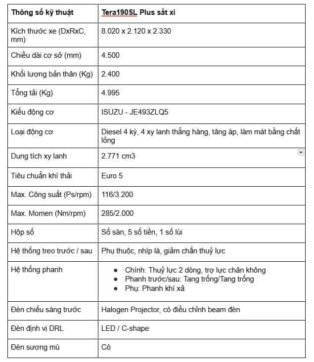 Tư vấn tài chính: Để nhận bảng dự toán lãi suất chi tiết và phương án vay phù hợp nhất với điều kiện kinh tế hiện tại, quý khách vui lòng liên hệ trực tiếp qua Hotline 0902 409 909. 3. Thông số kỹ thuật xe tải Tera190SL PlusDưới đây là bảng thông số kỹ thuật chi tiết của Tera190SL Plus: Lưu ý: Thông số kỹ thuật và trang bị trên xe có thể thay đổi mà không được báo trước đến Quý Khách hàng 4. Đánh giá Tera190SL Plus có đáng đầu tư không?Tera190SL Plus là dòng xe tải nhẹ được thiết kế để tối ưu hóa hiệu suất vận hành trong môi trường đô thị và liên tỉnh ngắn. Việc đánh giá mức độ "đáng mua" của mẫu xe này phụ thuộc vào sự tương thích giữa thông số kỹ thuật và nhu cầu khai thác thực tế của người dùng. Ưu điểm nổi bật của Tera190SL Plus