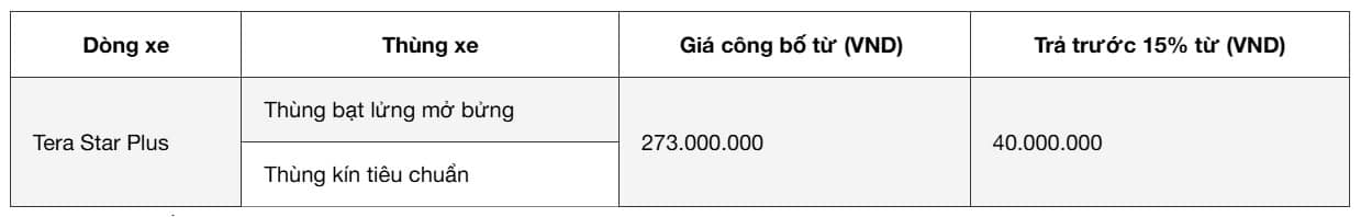 5. Giá xe tải 1.25 tấn hiện nayGiá xe tải 1.25 tấn trên thị trường hiện nay có sự dao động tùy theo loại thùng, cấu hình và thương hiệu xe. Mặt bằng chung của phân khúc này thường nằm trong khoảng từ 250 – 300 triệu đồng. Trong số các lựa chọn hiện nay, Tera Star Plus là dòng xe tải 1.25 tấn nổi bật với mức giá cân bằng giữa chi phí đầu tư và trang bị thực tế, phù hợp với nhu cầu kinh doanh và vận tải hàng hóa hiện đại. Bảng giá xe tải 1.25 tấn Tera Star Plus(*) Bảng giá được áp dụng từ ngày 05/03/2026, đã bao gồm thuế giá trị gia tăng (VAT). Liên hệ ngay Hotline hoặc hệ thống đại lý Teraco để nhận báo giá tốt nhất. (*) Bảng giá có thể thay đổi mà không được thông báo trước đến Quý Khách. 6. Gợi ý dòng xe tải 1.25 tấn đáng cân nhắc cho nhu cầu vận chuyển hàng hóaTrong phân khúc xe tải 1.25 tấn hiện nay, xe tải nhẹ Teraco - Tera Star Plus được xem là một trong những dòng xe tiêu biểu nhờ sự kết hợp giữa thiết kế hiện đại, động cơ công nghệ mới và khả năng khai thác thực tế hiệu quả. Tera Star Plus được trang bị động cơ xăng JL474QAK dung tích 1.5L ứng dụng công nghệ phun xăng trực tiếp GDi kết hợp công nghệ van biến thiên kép DVVT, giúp tối ưu hiệu suất đốt cháy nhiên liệu, mang lại khả năng vận hành mượt và duy trì lực kéo ổn định khi chở hàng. Công suất đạt 109 mã lực cùng mô-men xoắn 148 Nm giúp xe dễ dàng di chuyển trên nhiều điều kiện đường khác nhau, từ đô thị đến các tuyến liên tỉnh ngắn. Bên cạnh đó, xe đạt tiêu chuẩn khí thải Euro 5, góp phần tiết kiệm nhiên liệu và phù hợp xu hướng sử dụng lâu dài tại Việt Nam. Về thiết kế, Tera Star Plus sở hữu ngoại hình gọn gàng nhưng vẫn cứng cáp, với các chi tiết như đường gân dập nổi chạy dọc thân xe giúp tăng độ vững chãi cho khung vỏ, lưới tản nhiệt cỡ lớn kết hợp logo GDi, tăng độ nhận diện và hỗ trợ cải thiện hiệu quả làm mát động cơ. Hệ thống chiếu sáng gồm đèn Halogen projector có điều chỉnh beam kết hợp với đèn sương mù giúp hỗ trợ quan sát tốt hơn khi vận hành. Khoang cabin được thiết kế theo hướng tiện nghi với ghế bọc da, vô lăng trợ lực điện EPS, điều hòa hai chiều và màn hình giải trí trung tâm 7 inch, mang lại trải nghiệm sử dụng thoải mái tương tự xe du lịch. Khung gầm của xe được gia cố chắc chắn với chassis thép cường lực, kết hợp hệ thống treo trước độc lập MacPherson và treo sau nhíp lá cùng giảm chấn thủy lực, giúp xe duy trì độ ổn định khi chở hàng và vận hành trên nhiều dạng địa hình. Ngoài ra, các trang bị an toàn như hệ thống phanh ABS, EBD, camera lùi và cảm biến lùi hỗ trợ giúp người lái kiểm soát xe tốt hơn trong quá trình sử dụng hàng ngày. Để biết thêm thông tin chi tiết, Quý khách có thể liên hệ trực tiếp hệ thống đại lý chính hãng Daehan Motors trên toàn quốc hoặc gọi hotline 0902 409 909 để được hỗ trợ và tư vấn nhanh chóng. ---------------------------- Công ty TNHH Daehan Motors được thành lập vào năm 2015, là doanh nghiệp chuyên sản xuất, lắp ráp và cung ứng các dòng xe thương mại thương hiệu TERACO, trong đó chủ yếu là xe tải nhẹ và xe tải VAN. |