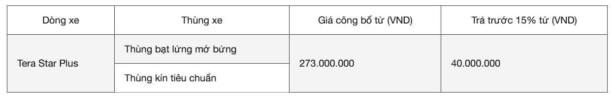 Xe tải 1 tấn 25 giá bao nhiêu năm 2026 là câu hỏi được nhiều khách hàng quan tâm khi tìm xe. Mức giá thực tế sẽ phụ thuộc vào cấu hình, loại thùng và thương hiệu, vì vậy cần xem xét tổng thể để lựa chọn phương án phù hợp với nhu cầu vận chuyển. 1. Xe tải 1 tấn 25 giá bao nhiêu năm 2026?Giá xe tải 1 tấn 25 năm 2026 dao động trong khoảng từ 250 đến 300 triệu đồng. Nổi bật ở phân khúc này là dòng xe Tera Star Plus nhờ thiết kế hiện đại, trang bị tiện nghi, động cơ tiết kiệm nhiên liệu và khả năng vận hành ổn định đáp ứng nhu cầu vận chuyển hàng hóa hiện nay. Bảng giá xe tải 1 tấn 25 Tera Star Plus mới nhất (*)(*) Bảng giá được áp dụng từ ngày 05/03/2026, đã bao gồm thuế giá trị gia tăng (VAT). Liên hệ ngay Hotline hoặc hệ thống đại lý Teraco để nhận báo giá tốt nhất. (*) Bảng giá có thể thay đổi mà không được thông báo trước đến Quý Khách. 2. Yếu tố ảnh hưởng giá xe tải 1 tấn 25Xe tải 1 tấn 25 giá bao nhiêu phụ thuộc vào cấu hình thùng hàng và trang bị trên xe Loại thùng xe Trong phân khúc này, kết cấu thùng hàng đóng vai trò quan trọng trong việc định hình tổng chi phí đầu tư và hiệu quả khai thác dài hạn. Một chiếc thùng mui bạt với khả năng mở bửng linh hoạt giúp giảm thời gian và nhân lực bốc xếp, từ đó tối ưu chi phí vận hành cho các mặt hàng tiêu dùng nhanh. Ngược lại, thùng kín là giải pháp chuyên dụng giúp bảo vệ hàng hóa tuyệt đối trước các tác động từ thời tiết và môi trường khói bụi đô thị, đảm bảo chất lượng nguyên vẹn của sản phẩm từ kho bãi đến điểm giao nhận cuối cùng. Kích thước thùng và khả năng khai thácNhững dòng xe có kích thước thùng lớn, tối ưu không gian chở hàng thường có giá cao hơn nhờ khả năng vận chuyển được nhiều hàng hơn trong mỗi chuyến, giúp tăng hiệu quả kinh doanh. Cấu hình động cơ và công nghệXe tải 1.25 tấn sử dụng động cơ công nghệ thế hệ mới mang đến khả năng vận hành ổn định và tối ưu nhiên liệu trong quá trình sử dụng lâu dài. Trang bị tiện nghi và an toànCác trang bị như điều hòa, màn hình giải trí, camera lùi, hệ thống phanh ABS hay EBD cũng góp phần tạo nên sự khác biệt về giá. Xe được đầu tư nhiều tiện ích sẽ mang lại trải nghiệm sử dụng tốt hơn và an toàn hơn trong vận hành thực tế. 3. Nên chọn xe tải 1 tấn 25 thùng bạt hay thùng kín?Việc lựa chọn loại thùng phù hợp ảnh hưởng trực tiếp đến hiệu quả vận chuyển và cách khai thác xe trong thực tế. Với xe tải 1.25 tấn, hai cấu hình phổ biến là thùng bạt và thùng kín, mỗi loại sẽ phù hợp với từng nhóm hàng và nhu cầu sử dụng khác nhau. Thùng bạt – Linh hoạt khi vận chuyển và bốc xếp hàng hóaThùng bạt phủ có thiết kế mở bửng và cửa sau giúp việc lên xuống hàng hóa dễ dàng, tiết kiệm thời gian trong mỗi chuyến hàng. Loại thùng này phù hợp để chở các mặt hàng như nước uống, hàng tiêu dùng, hàng tạp hóa, nông sản, nội thất, vật tư công trình, thiết bị lắp đặt và các loại hàng có kích thước lớn hoặc cần bốc xếp từ nhiều phía. Giải pháp thùng mui bạt giúp cắt giảm đáng kể thời gian xếp dỡ hàng hóa, từ đó tối ưu hóa thời gian vận hành và gia tăng lợi nhuận cho chủ đầu tư. Thùng kín – Bảo vệ hàng hóa an toàn trong quá trình vận chuyểnThùng kín phù hợp với nhu cầu vận chuyển các mặt hàng cần tránh tác động từ môi trường như nắng, mưa hoặc bụi bẩn. Kết cấu kín giúp hàng hóa được bảo quản tốt và an toàn hơn trong suốt quá trình di chuyển. Loại thùng này thường được sử dụng để chở hàng điện tử, mỹ phẩm, thực phẩm đóng gói, hàng thương mại điện tử, hàng kho vận, hàng đóng thùng carton và các mặt hàng có giá trị cao cần hạn chế va chạm và ảnh hưởng bên ngoài. Nên chọn loại thùng nào?Nếu nhu cầu kinh doanh vận tải của bạn đòi hỏi việc thường xuyên thay đổi mặt hàng vận chuyển và cần một quy trình bốc dỡ hàng hóa nhanh chóng, xe tải thùng bạt sẽ là phương án vận tải hoàn hảo. Trong khi đó, đối với những mặt hàng đòi hỏi tiêu chuẩn bảo quản cao, xe tải thùng kín chính là giải pháp an toàn cho doanh nghiệp. 4. Tải nhẹ máy xăng 1 tấn 25 – Tera Star PlusTrong phân khúc xe tải 1.25 tấn hiện nay, Tera Star Plus là dòng xe được nhiều người lựa chọn nhờ sự cân bằng giữa chi phí đầu tư và hiệu quả vận hành thực tế. Mẫu xe này không chỉ đáp ứng tốt nhu cầu chở hàng mà còn được đầu tư đồng bộ về động cơ, khung gầm và tiện nghi nhằm tối ưu trải nghiệm sử dụng lâu dài. Động cơ xăng 1.5L – Vận hành ổn định và tiết kiệm nhiên liệuTera Star Plus được trang bị động cơ xăng JL474QAK dung tích 1.5L, ứng dụng công nghệ phun xăng trực tiếp GDi kết hợp hệ thống van biến thiên kép DVVT. Cấu hình này giúp tối ưu quá trình đốt cháy nhiên liệu, từ đó nâng cao hiệu suất vận hành và kiểm soát mức tiêu hao nhiên liệu hiệu quả hơn. Khối động cơ cho c