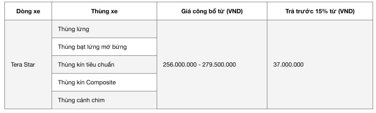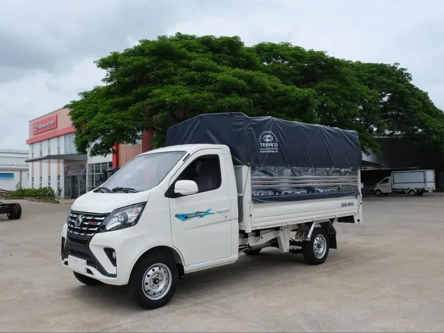4. Giá xe tải 990kg mới nhấtGiá xe tải 990kg trên thị trường hiện nay có sự dao động tùy theo loại thùng, trang bị đi kèm và thương hiệu. Theo khảo sát mới nhất năm 2026, mặt bằng chung của phân khúc này thường nằm trong khoảng từ 250 – 300 triệu đồng. Trong phân khúc này, Tera Star được lựa chọn nhờ mức giá dễ tiếp cận, động cơ công nghệ hiện đại cùng các trang bị tiện nghi như xe du lịch. Nhờ lợi thế đó Tera Star trở thành một trong những lựa chọn nổi bật trong phân khúc xe tải 990kg hiện nay. Bảng giá xe tải 990kg Tera Star (*)(*) Bảng giá được áp dụng từ ngày 05/03/2026, đã bao gồm thuế giá trị gia tăng (VAT). Liên hệ ngay Hotline hoặc hệ thống đại lý Teraco để nhận báo giá tốt nhất. (*) Bảng giá có thể thay đổi mà không được thông báo trước đến Quý Khách. 5. Tera Star - Tải nhẹ máy xăng tiết kiệm nhiên liệuTera Star là dòng xe tải nhẹ máy xăng thuộc phân khúc xe tải 990kg, được phát triển theo định hướng tối ưu cho nhu cầu vận chuyển linh hoạt trong thực tế. Mẫu xe này gây ấn tượng nhờ sự kết hợp giữa thiết kế hiện đại, động cơ thế hệ mới và hệ thống trang bị hướng đến trải nghiệm người lái, là lựa chọn hàng đầu trong nhóm xe tải nhẹ 990kg. Động cơ thế hệ mới, vận hành mạnh mẽ và ổn địnhTera Star được trang bị động cơ xăng JL474QAK dung tích 1.5L ứng dụng công nghệ phun xăng trực tiếp GDi kết hợp công nghệ van biến thiên kép DVVT. Cấu hình này giúp tối ưu quá trình đốt cháy nhiên liệu giúp tiết kiệm nhiên liệu, nâng cao hiệu suất vận hành và duy trì sự ổn định khi xe di chuyển trong nhiều điều kiện khác nhau. Khối động cơ cho công suất tối đa 109 mã lực và mô-men xoắn cực đại 148 Nm, đáp ứng tốt nhu cầu vận chuyển hàng hóa trong thực tế. Bên cạnh đó, xe còn đạt tiêu chuẩn khí thải Euro 5, vừa đảm bảo hiệu quả vận hành vừa phù hợp với xu hướng vận tải tại Việt Nam. Thiết kế hiện đại, mang phong cách xe du lịchKhác với nhiều dòng xe tải nhỏ truyền thống, Tera Star sở hữu ngôn ngữ thiết kế hiện đại, mang hơi hướng xe du lịch với các đường nét mạnh mẽ và hài hòa. Phần đầu xe nổi bật với mặt ca-lăng đa tầng kết hợp logo công nghệ GDi tạo điểm nhấn nhận diện. Cản trước được thiết kế chắc chắn, các đường gân dập nổi chạy dọc thân xe không chỉ tăng tính thẩm mỹ mà còn cải thiện yếu tố khí động học. Tổng thể mang lại cảm giác cứng cáp nhưng vẫn tinh tế và dễ tiếp cận với người dùng. Nội thất tiện nghi, tối ưu trải nghiệm sử dụngKhông gian cabin của Tera Star được hoàn thiện theo hướng lấy người lái làm trung tâm, mang lại cảm giác thoải mái ngay cả khi vận hành trong thời gian dài. Xe được trang bị ghế bọc da thiết kế ôm sát cơ thể, tích hợp bệ tỳ tay trung tâm giúp giảm mệt mỏi khi di chuyển liên tục. Hệ thống điều hòa hai chiều duy trì nhiệt độ dễ chịu trong cabin, kết hợp cửa kính chỉnh điện một chạm giúp thao tác nhanh chóng. Ngoài ra, màn hình giải trí trung tâm 7 inch hỗ trợ kết nối đa phương tiện, mang đến trải nghiệm lái xe hiện đại và tiện nghi hơn trong quá trình sử dụng hàng ngày. Trang bị an toàn, hỗ trợ vận hành thực tếTera Star được trang bị đầy đủ các hệ thống an toàn cần thiết, hỗ trợ người lái trong quá trình vận hành hàng ngày. Hệ thống chống bó cứng phanh ABS giúp kiểm soát xe tốt hơn khi phanh gấp, trong khi hệ thống phân bổ lực phanh điện tử EBD tối ưu hiệu quả phanh. Camera lùi kết hợp cảm biến hỗ trợ quan sát phía sau, giúp việc đỗ xe và di chuyển trong không gian hẹp trở nên dễ dàng hơn. Cụm đèn Halogen projector có điều chỉnh beam tích hợp đèn sương mù cải thiện tầm nhìn trong điều kiện thiếu sáng, đồng thời gương chiếu hậu được thiết kế mở rộng góc quan sát nhằm hạn chế điểm mù. 6. Xe tải 990kg phù hợp chở những loại hàng hóa nào?Với lợi thế về kích thước nhỏ gọn và khả năng di chuyển linh hoạt, dòng xe này không chỉ đáp ứng nhu cầu vận chuyển cơ bản mà còn là giải pháp tối ưu cho các mô hình kinh doanh có tần suất luân chuyển hàng hóa cao trong đô thị. Hàng tiêu dùng và thực phẩm đóng góiXe tải 990kg là lựa chọn hàng đầu để phân phối các mặt hàng tạp hóa, bánh kẹo, nước giải khát hoặc thực phẩm đóng gói từ kho tổng đến các đại lý, siêu thị mini và cửa hàng tiện lợi. Nội thất, gia dụng và điện máyNhờ sàn thùng thấp và không gian chứa đồ được tối ưu, các mặt hàng như bàn ghế, tủ kệ nhỏ, thiết bị điện máy gia dụng hoàn toàn có thể được vận chuyển an toàn và nhanh chóng đến tận tay khách hàng trong các ngõ hẹp. Hàng thương mại điện tử và chuyển phát nhanhTrong chuỗi cung ứng chặng cuối (last-mile delivery), dòng xe này đóng vai trò then chốt khi vận chuyển bưu phẩm từ các bưu cục đến các điểm giao nhận lẻ. Khả năng xoay trở tốt giúp tối ưu thời gian giao hàng và nâng cao năng suất v